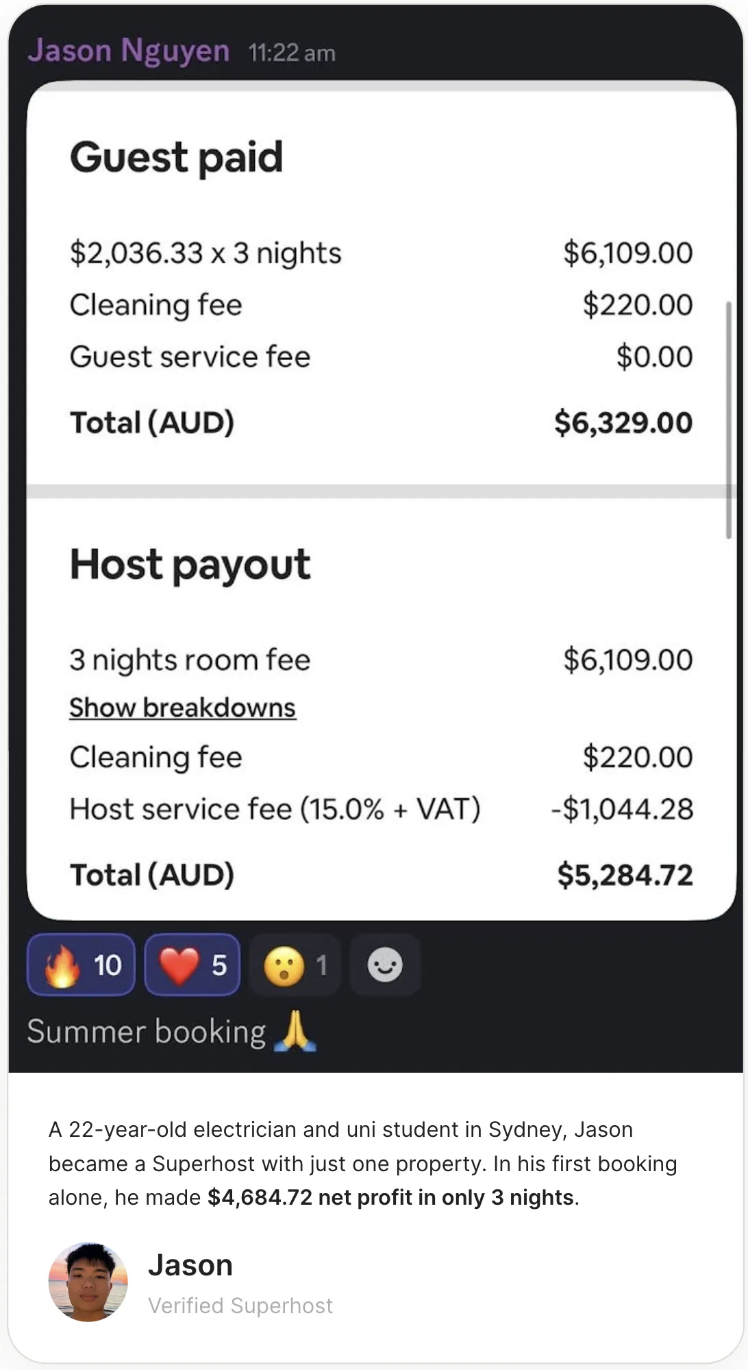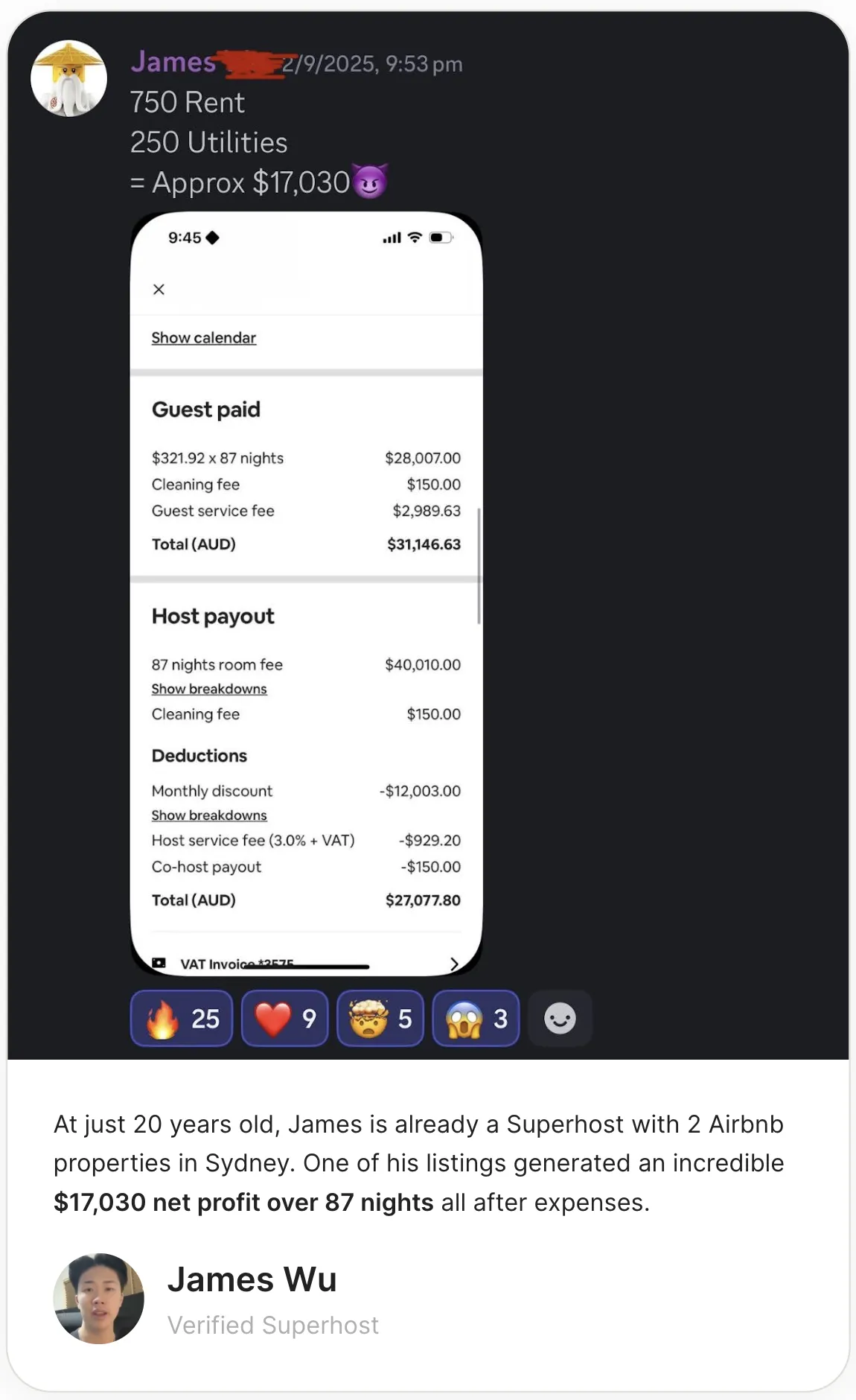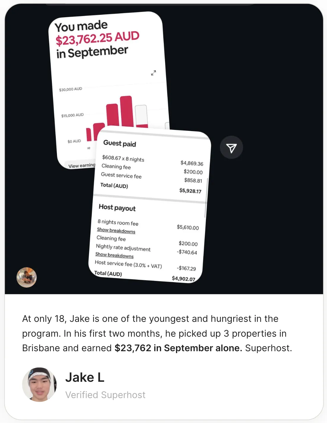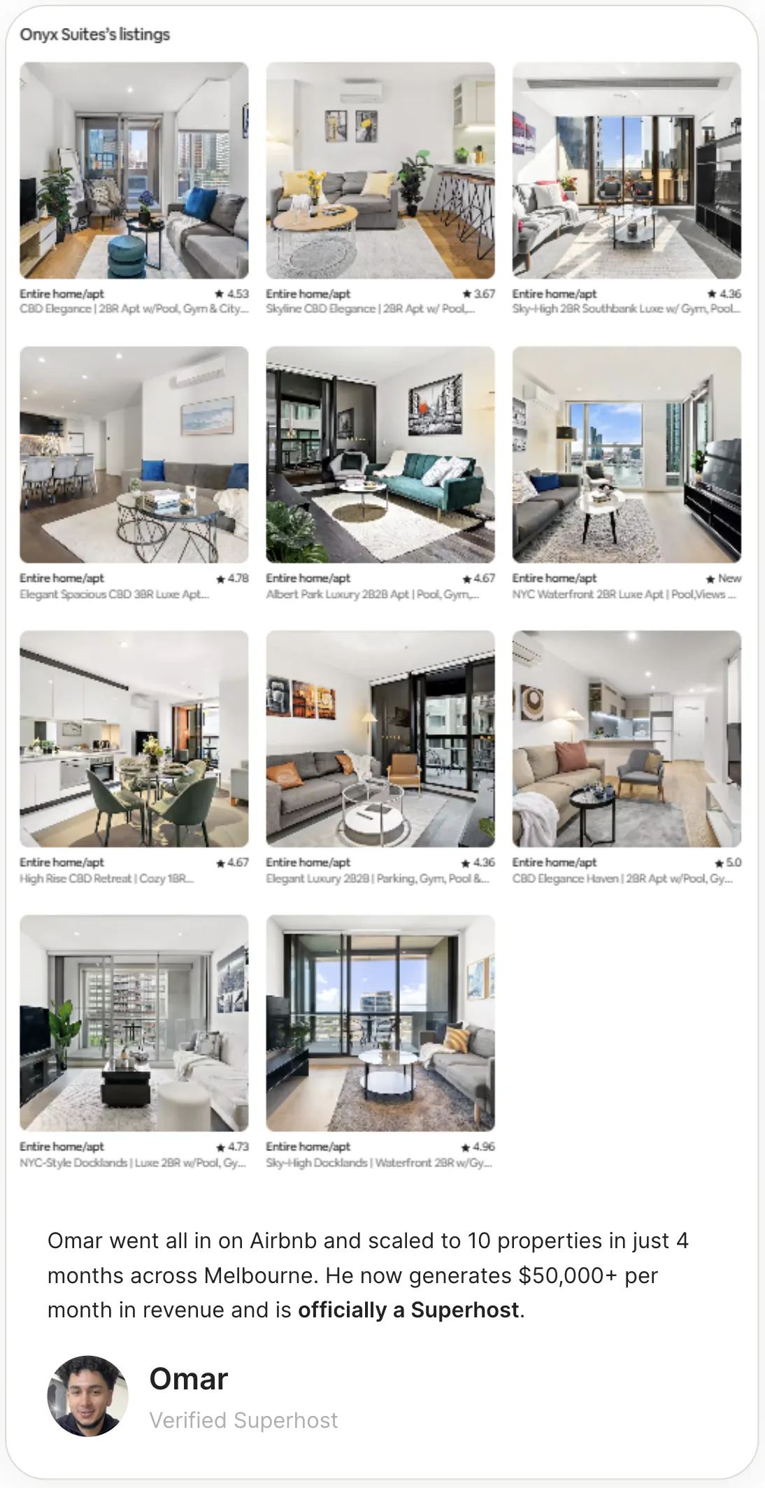 At 22, I built 45+ Airbnb properties generating $300,000 monthly without owning any. After trying business models like SMMA, I discovered this hands-on business model that creates real income. I have a background in Property at the University of Melbourne and now I am looking to help others start their own short term rental business.